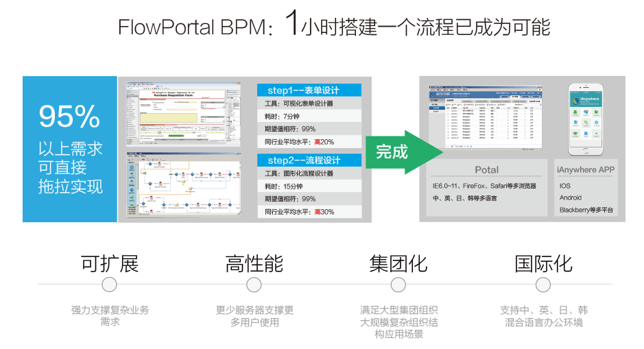 FlowPortal. net具有方便、易用和可擴展的特性,一方面在FlowPortal. net中流程、表單、報表一切設計皆是可視化免編程的,另一方面FlowPortal. net采用微軟.net技術做為流程和表單的基礎技術,具有良好的開放性、可擴展性和彈性,是企業進行業務流程管理的理想戰略平臺。